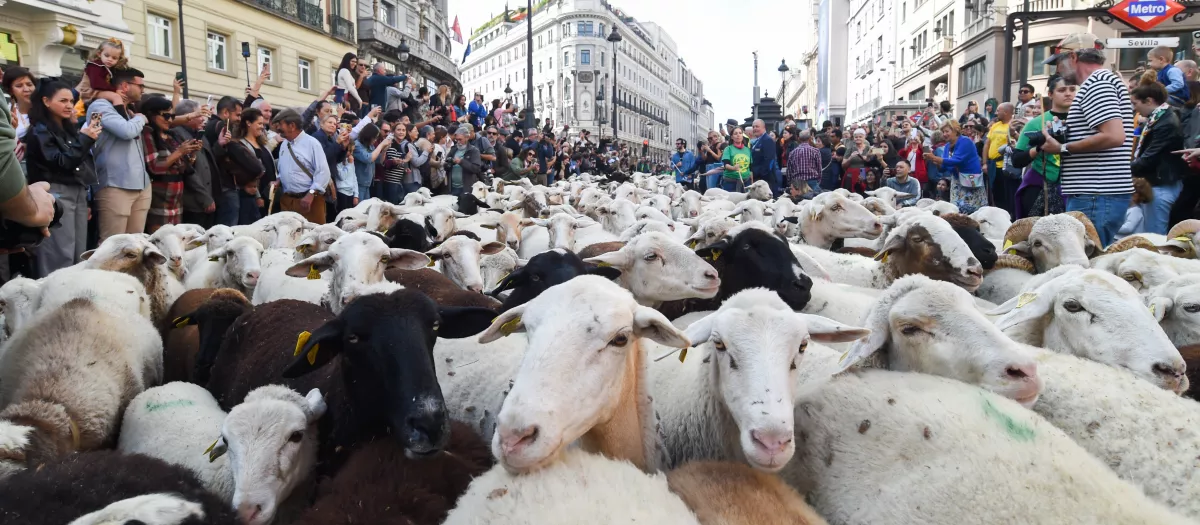Rebaños de ovejas atraviesan el centro de Madrid durante la 32ª edición de la Fiesta del Pastor y de la Trashumancia, a 19 de octubre de 2025, en Madrid (España).