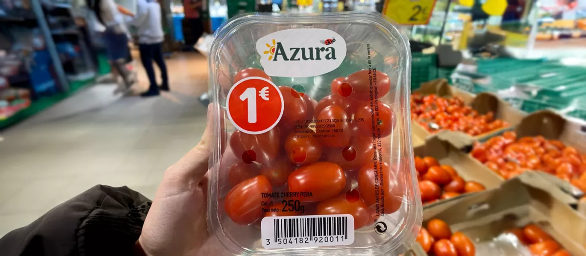 Paquete de tomates cherry de la marca Azura etiquitados con origen Marruecos