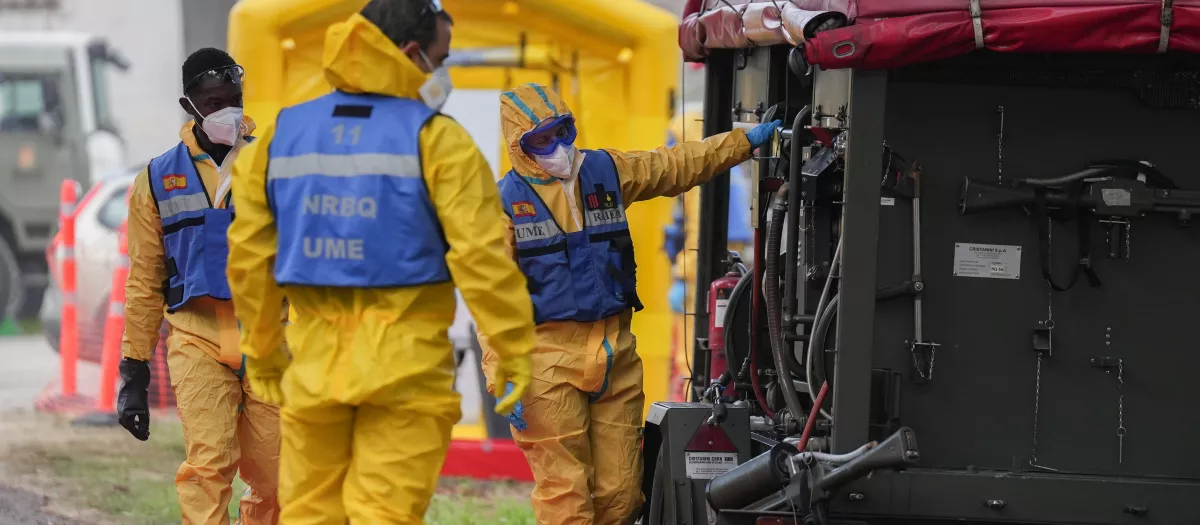 Varias personas de la UME desinfectan vehículo para el control de la peste porcina en Barcelona (Cataluña)