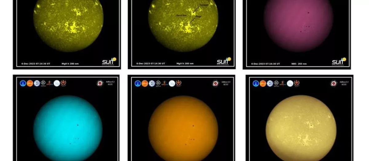 El instrumento de luz ultravioleta SUIT del observatorio espacial indio Aditya-L1 ha capturado las primeras imágenes de disco completo del Sol en longitud de onda de 200-400 nm.