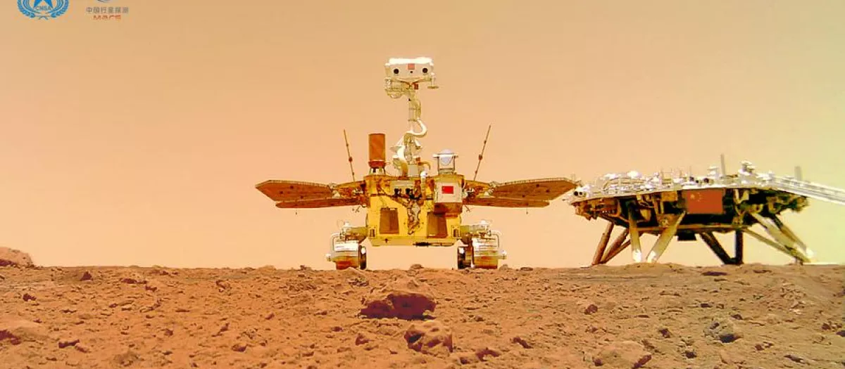 Foto publicada en 2021 por la Administración Nacional del Espacio de China (CNSA) que muestra el primer explorador marciano chino, Zhurong, con la plataforma de aterrizaje