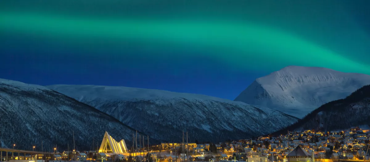 La ciudad de Tromsø, en Noruega, iluminada por una aurora boreal