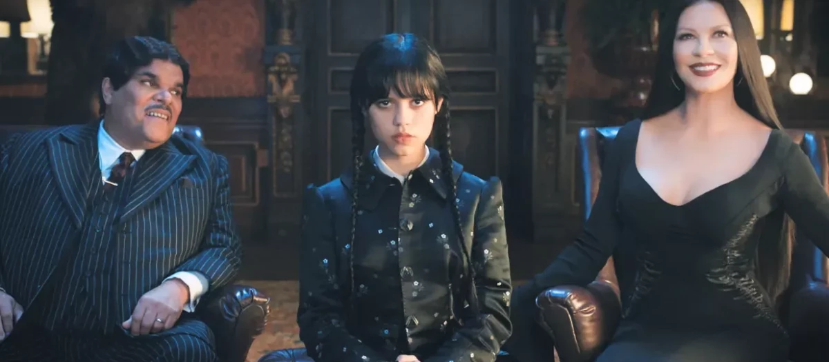 Jenna Ortega, en el centro, junto a los actores Luis Guzman y Catherine Zeta-Jones