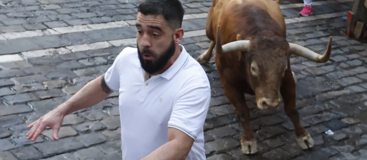 Corredor ante uno de los toros de San Fermín 2025
