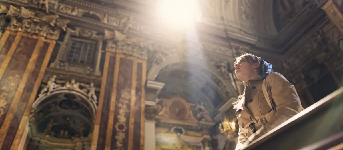 Una joven pasea por el interior de una iglesia