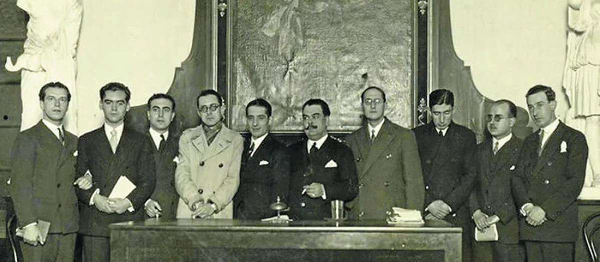 Celebración del tricentenario de Góngora en el Ateneo de Sevilla en diciembre de 1927. De izquierda a derecha: Rafael Alberti, Federico García Lorca, Juan Chabás, Mauricio Bacarisse, José María Romero Martínez (presidente de la sección de literatura del Ateneo), Manuel Blasco Garzón (presidente del Ateneo de Sevilla), Jorge Guillén, José Bergamín, Dámaso Alonso y Gerardo Diego.