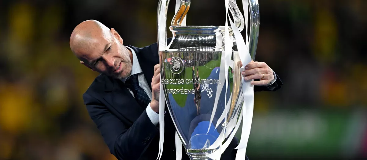 01 June 2024, United Kingdom, London: Former Real Madrid coach Zinedine Zidane, presents the UEFA Champions League trophy for the award ceremony after the UEFA Champions League final soccer match between Borussia Dortmund and Real Madrid CF at Wembley Stadium. Photo: Robert Michael/dpa