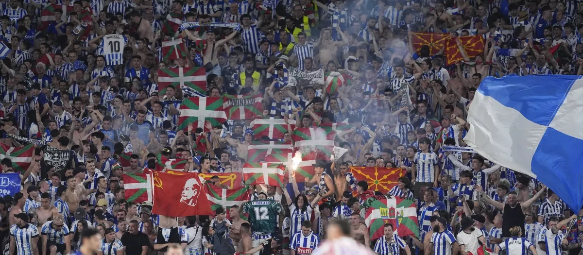 Gran parte de la afición de la Real Sociedad convirtió la final de la Copa del Rey en un aquelarre independentista vasco de extrema izquierda. Primero fue Arnaldo Otegi el que pidió que se llenara el campo de ikurriñas, pero también vimos banderas comunistas y estandartes para pedir la independencia de Navarra, lugar que los independentistas vascos consideran parte de Euskal Herria. En cambio, no se vio ni una sola de España en el fondo que ocupaba la afición txuri-urdin.