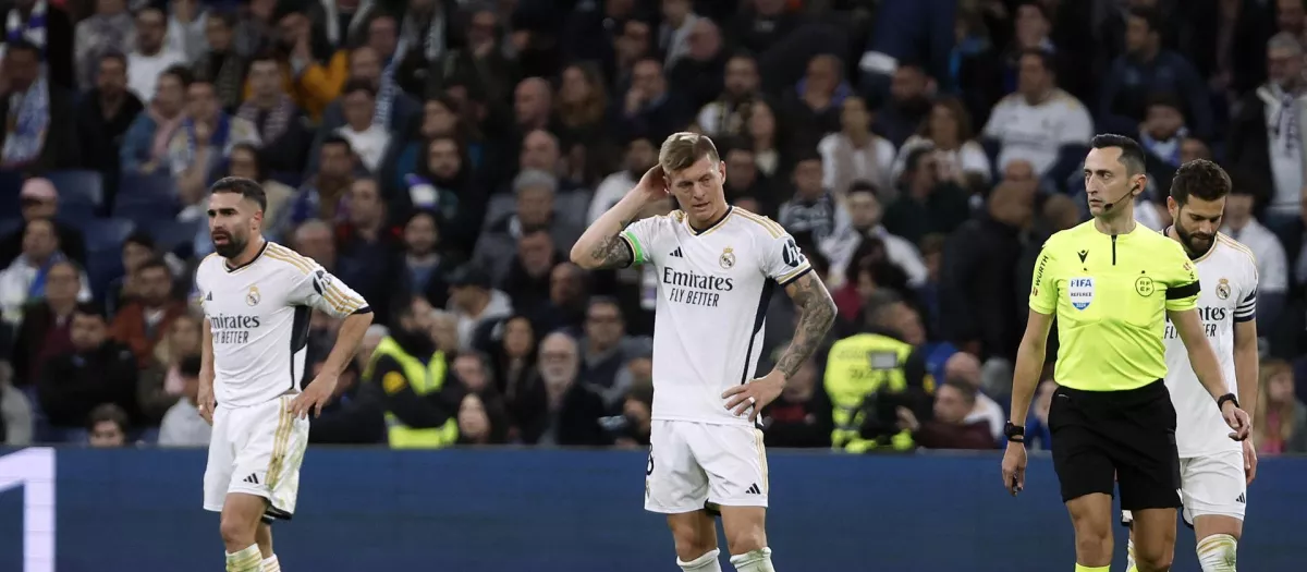 Carvajal, Kroos y Nacho, ante el árbitro Sánchez Martínez, en el duelo ante el Atlético