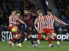 Georges Mikautadze (d) pelea un balón con Alejandro Catena (i)