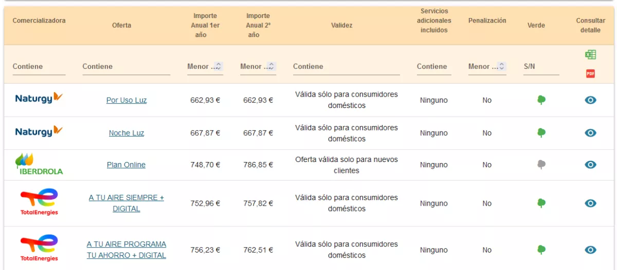 Ejemplo de resultados del comparador de precios de luz y gas de la CNMC