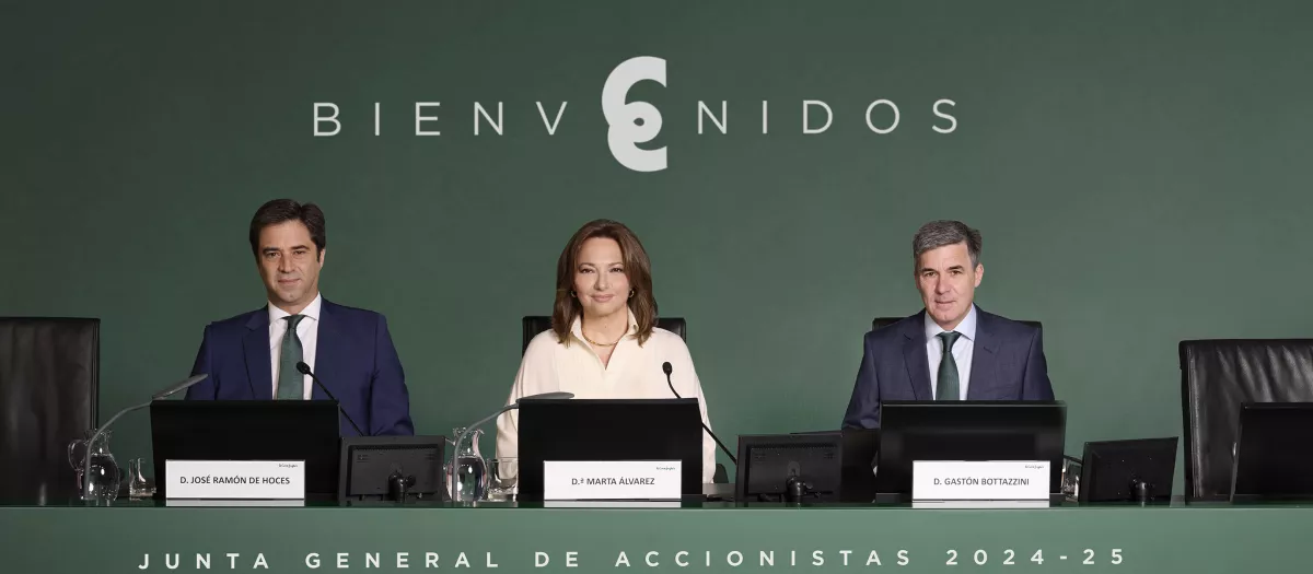 la presidenta Marta Álvarez, en la última junta de accionistas con el recién destituido Gastón Bottazzini y el consejero secretario, José Ramón de Hoces.