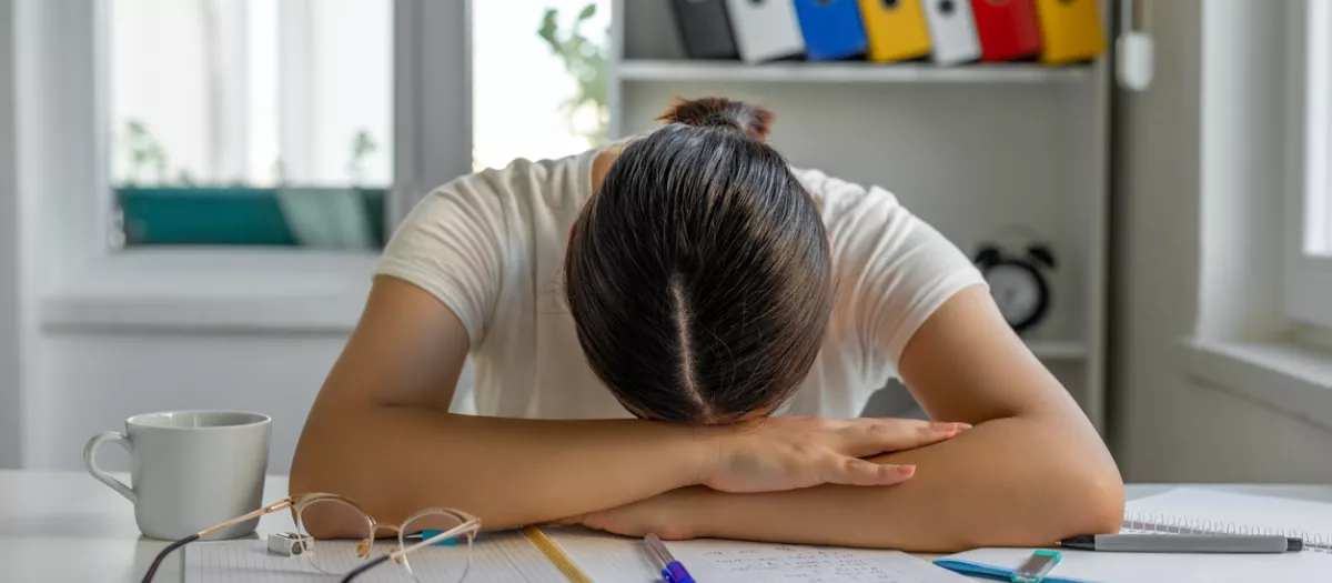 Chica cansada durmiendo en su escritorio durante el trabajo