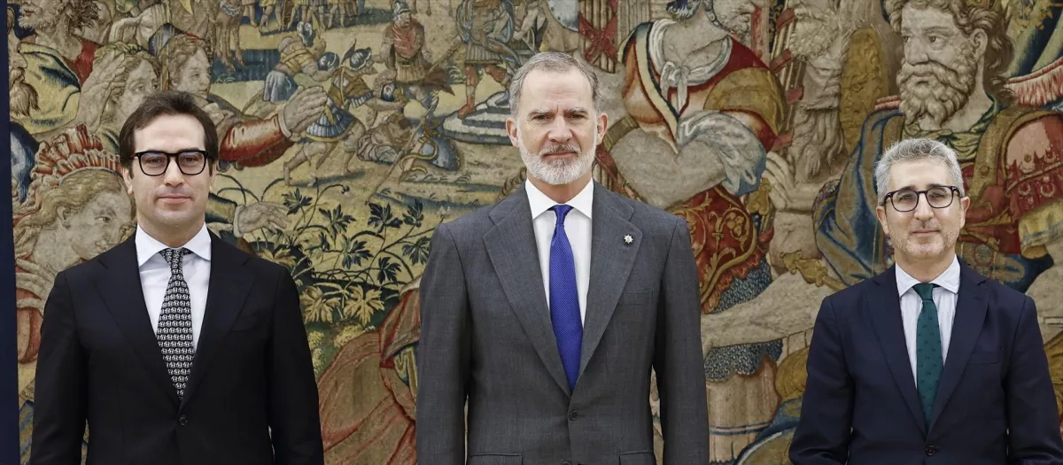 El nuevo vicepresidente primero y ministro de Economía, Comercio y Empresa, Carlos Cuerpo; el Rey Felipe VI, y el ministro de Hacienda, Arcadi España, durante la jura de su cargo, en el Palacio de La Zarzuela, a 27 de marzo de 2026, en Madrid (España). Sánchez anunciaba ayer que Cuerpo y España ocuparían los cargos que dejaba Montero al incurrir en las elecciones autonómicas de Andalucía. Cuerpo asume la vicepresidencia primera, además de continuar al cargo de la cartera de Economía, Comercio y Empresa, y Arcadi asume la cartera de Hacienda.