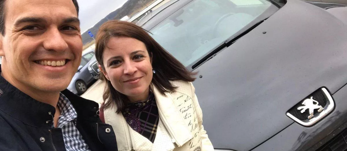 Pedro Sánchez posa para su Twitter con su Peugeot 407 y Adriana Lastra
