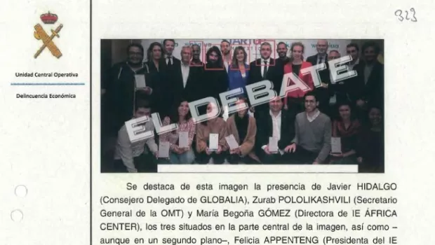 La primera fotografía que incluyen los investigadores se ve a la mujer de Sánchez en primer plano junto a Javier Hidalgo que, en el momento en que se tomó la imagen era consejero delegado de Globalia. Es decir, de Air Europa. La fotografía se hizo el 20 de enero de 2020 en un stand de la Feria Internacional de Turismo que se celebró en esa fecha en Madrid.