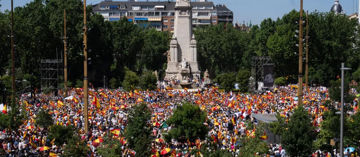 Desde primera hora de la mañana miles de personas caminaban hacia la madrileña Plaza de España para acudir a la concentración que ha auspiciado el PP -aunque han quitado sus siglas de ella- este domingo con el objetivo de clamar contra la deriva y la corrupción del Gobierno de Pedro Sánchez. De esta manera, los 100.000 manifestantes, según los organizadores, han abarrotado la zona y las calles aledañas en una protesta en la que estaba presente la plana mayor de los ‘populares’, incluidos los expresidentes Mariano Rajoy y José María Aznar.