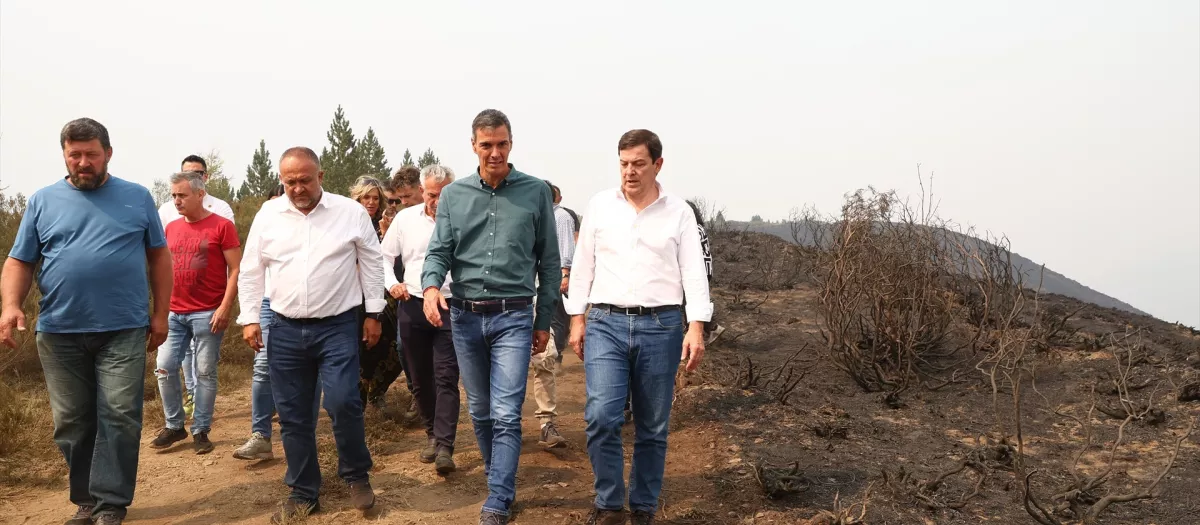 Pedro Sánchez visita la zona afectada por el incendio de Orallo en Villablino (León) acompañado por Fernández Mañueco