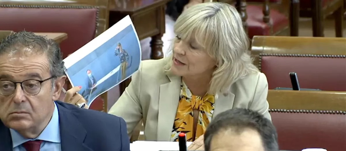 La senadora Mari Mar Caballero mostrando una imagen de Chivite cuadrándose ante Santos Cerdán