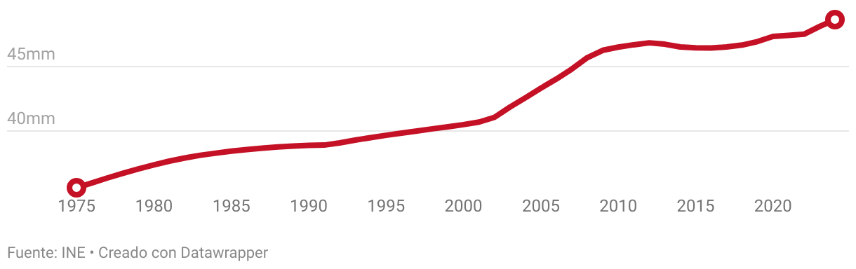 En cambio, al analizar los datos de natalidad, la curva va justo en la dirección contraria. España ha pasado de 669.378 nacimientos en 1975 a 318.005 en 2024, y la tasa por cada mil habitantes se ha desplomado de 18,7 a 6,54. También el número de hijos por mujer ha caído de 2,77 a 1,1, muy lejos del nivel necesario para asegurar el reemplazo generacional.