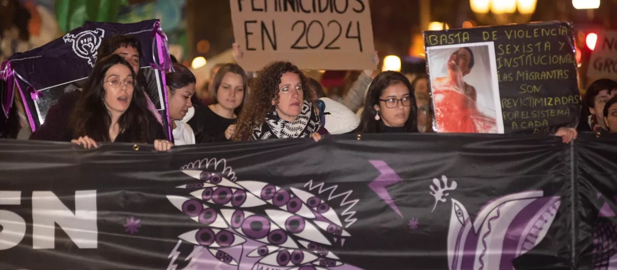 Varias personas durante la manifestación por el 25N en el Paseo de Gràcia con Diagonal, Barcelona
