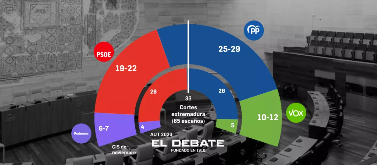 El PSOE lograría entre 19 y 22 escaños (actualmente tiene 28), Vox, entre 10 y 12 escaños, de modo que duplicaría los cinco actuales, y Unidas por Extremadura -Podemos e Izquierda Unida- que ahora tiene cuatro, subiría hasta los seis o siete representantes.