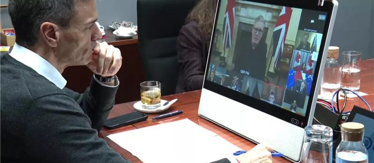 La agenda del presidente del Gobierno de ayer se resumía en dos renglones: «16:45 h. Participa, por videoconferencia, en la reunión de la Coalición de Voluntarios por Ucrania».
