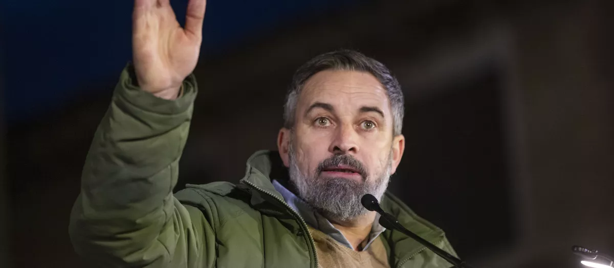 El presidente de Vox, Santiago Abascal, interviene en un acto del partido de cara a las próximas elecciones regionales del 8 de febrero, este martes en Utebo (Zaragoza).