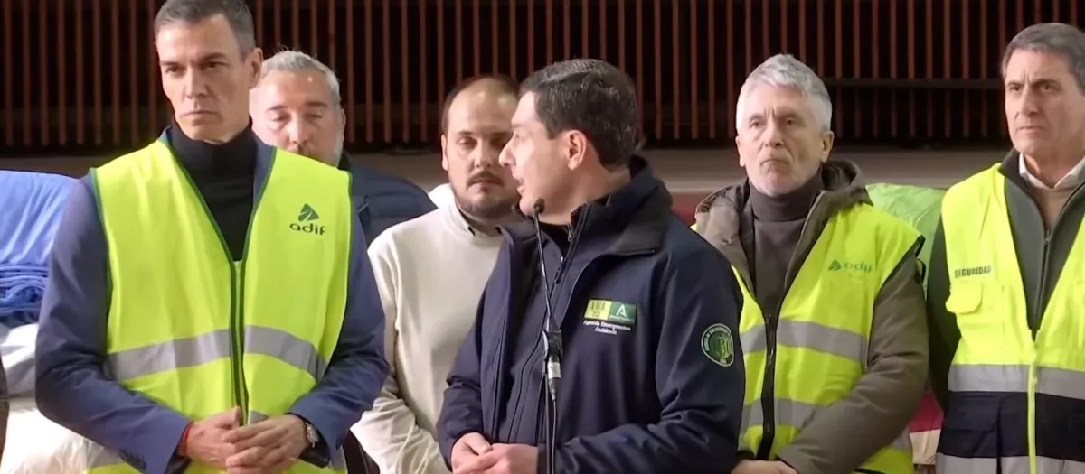La secuencia fue reveladora. Moreno se acercó al micrófono y, un paso por detrás, se quedaron Sánchez y el resto de la comitiva. El presidente andaluz empezó agradeciendo la solidaridad de los vecinos de Adamuz y, también «la coordinación absolutamente necesaria». Después añadió: «En el día de ayer y en el día de hoy hemos estado trabajando conjuntamente con el Ayuntamiento, con la Diputación de Córdoba, con la Administración General del Estado, con el Gobierno de España». Al decir esto último, Moreno se giró buscando la mirada del aludido, del presidente del Ejecutivo, pero no la encontró. Éste estaba mirando a todos los lados posibles menos al máximo responsable de la Junta de Andalucía.