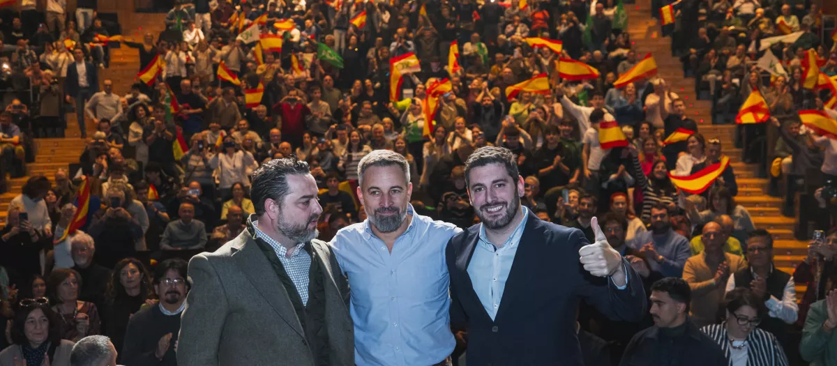 El presidente de Vox, Santiago Abascal; el candidato a la presidencia de Aragón, Alejandro Nolasco; y el cabeza de lista por Huesca, David Arranz.VOX.