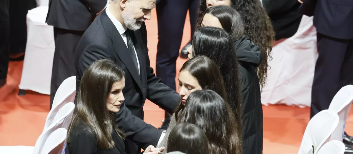 El rey Felipe y la reina Letizia hablan con familiares de las víctimas durante el funeral que se celebra este jueves en Huelva.