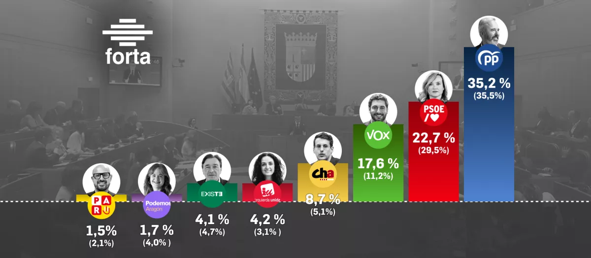 El sondeo que ha elaborado la Federación de Organismos de Radio y Televisión Autonómicos (FORTA) para las televisiones regionales pronostica una victoria clara para el candidato del PP y actual presidente autonómico, Jorge Azcón, en las elecciones de Aragón de este domingo 8 de febrero. Los 'populares' conseguirían entre 26 y 29 escaños –hace tres años se quedaron con 28– y un porcentaje de voto del 35,2 %, tres décimas menos que en 2023