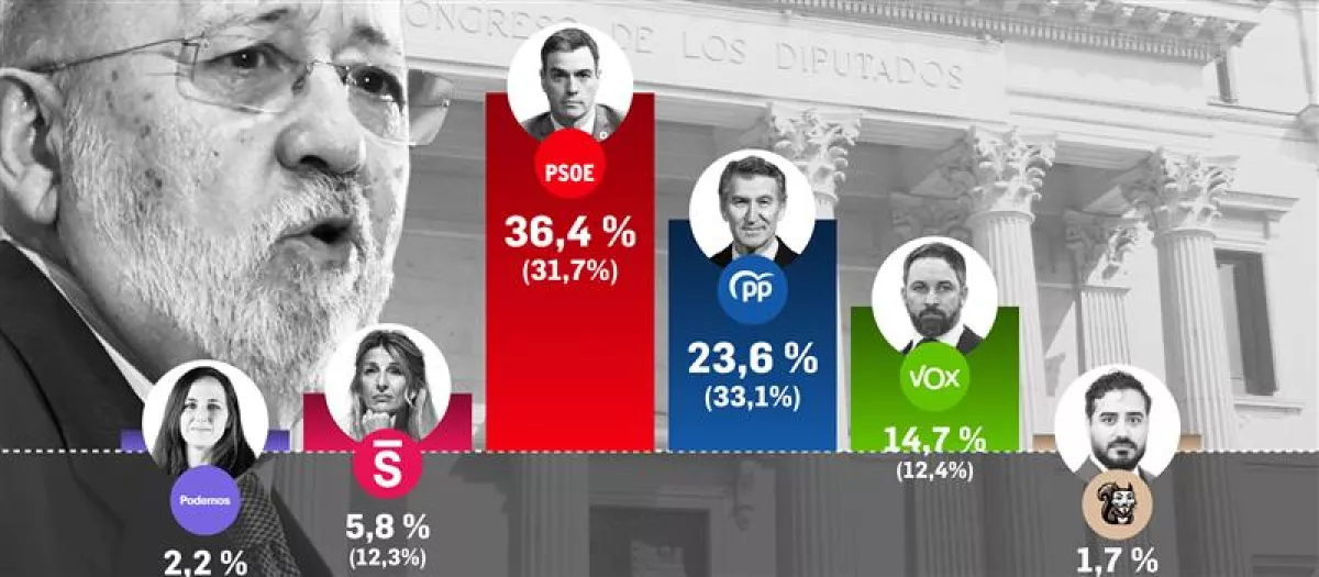 Asimismo, sitúa a Vox dos puntos por debajo de lo que obtuvo en marzo, con el 14,7 %, y Sumar baja en torno a punto, con el 5,8 %. ERC continúa por delante de Podemos, siete décimas, con el 2,9 % frente al 2,2 % de los morados, en pleno debate sobre una posible unión de la extrema izquierda para unas próximas generales. Le siguen Se Acabó la fiesta, con el 1,7 %, Bildu, con el 1,3 %, y Junts y el PNV, ambos con el 0,8 %.