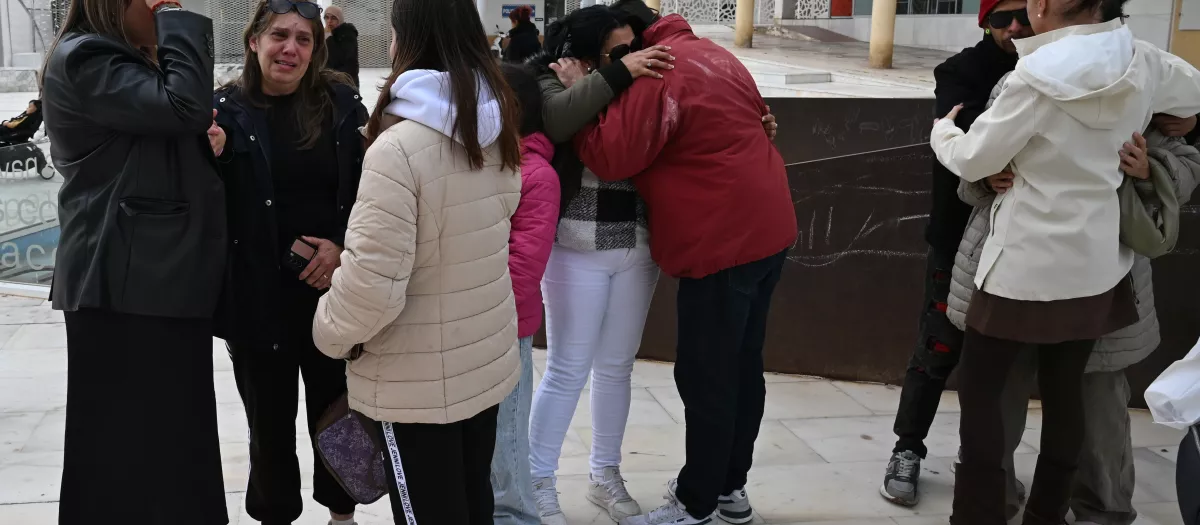 El abuelo materno de Lucas, con abrigo rojo, en el centro, llora junto a otros familiares y vecinos de esta localidad almeriense tras un minuto de silencio que se ha guardado en un acto institucional a las puertas del Ayuntamiento donde las banderas ondean a media asta con crespón negro