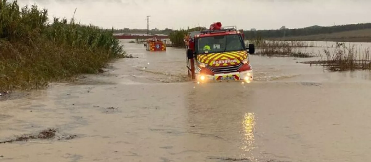 Un vehículo de Bomberos en un camino inundado en Huelva