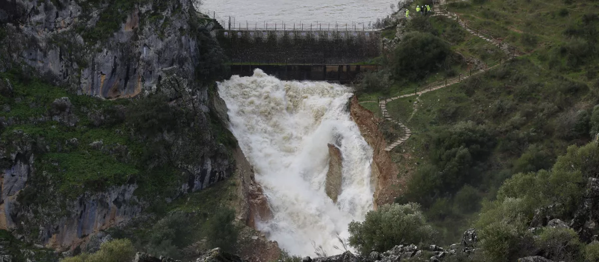 La presa de los Caballeros, también conocida como del Hundidero, en Montejaque (Málaga), ha activado por primera vez sus aliviaderos tras llegar a su capacidad máxima después de las intensas lluvias de las últimas semanas. Construida en 1924, esta infraestructura ha generado una imagen histórica al desembalsar por primera vez desde su construcción, confirmando la efectividad del sistema de seguridad ante la previsión de nuevas precipitaciones en la zona.