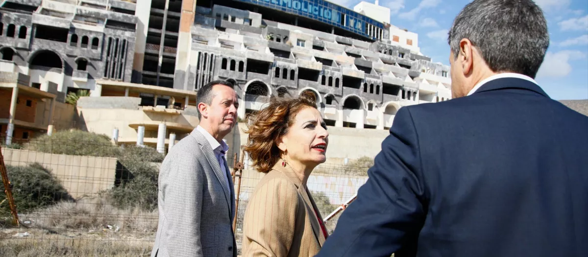 (Foto de ARCHIVO) La vicepresidenta primera y ministra de Hacienda, María Jesús Montero, a su llegada al hotel ilegal de El Algarrobico el día que prometió derruirlo