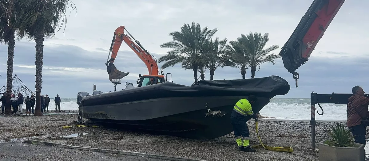 Narcolancha varada en la playa de la Herradura, en Almuñécar (Granada)
