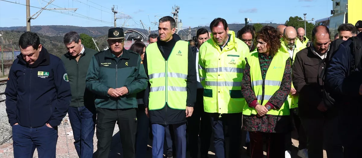 (Foto de ARCHIVO) Pedro Sánchez, Óscar Puente y María Jesús Montero, en la zona del accidente ferroviario de Adamuz