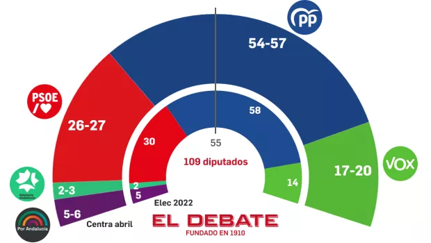 El estudio se basa en 3.600 entrevistas realizadas entre el 27 de febrero y el 12 de marzo, antes de que el presidente de la Junta de Andalucía anunciara la convocatoria electoral el pasado 23 de marzo y otorga una clara victoria al PP, aunque deja abierta la posibilidad de que quede ligeramente por debajo de la mayoría absoluta, fijada en 55 escaños.