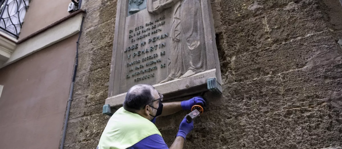 Retirada de la placa de la casa natal de Pemán, en una imagen de archivo