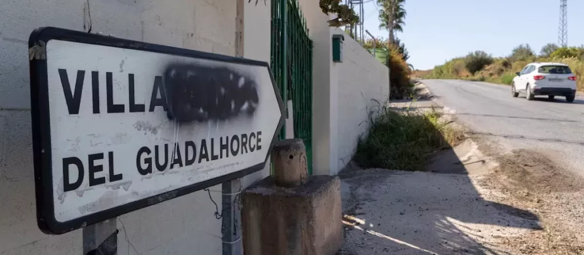 Señal que indica la entrada a la pedanía malagueña de Villafranco del Guadalhorce, perteneciente a la localidad de Alhaurín el Grande, con parte del nombre tachado