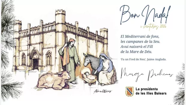 La felicitación se acompaña de una ilustración de Alex Ollers. La escena sitúa el nacimiento frente a la Lonja de Palma y convierte el entorno en un belén urbano. «Transforma el gran templo gótico en un belén que nos invita a pararnos un momento y mirar con ojos nuevos aquello que tenemos más cerca», subrayó la dirigente del Ejecutivo autonómico.