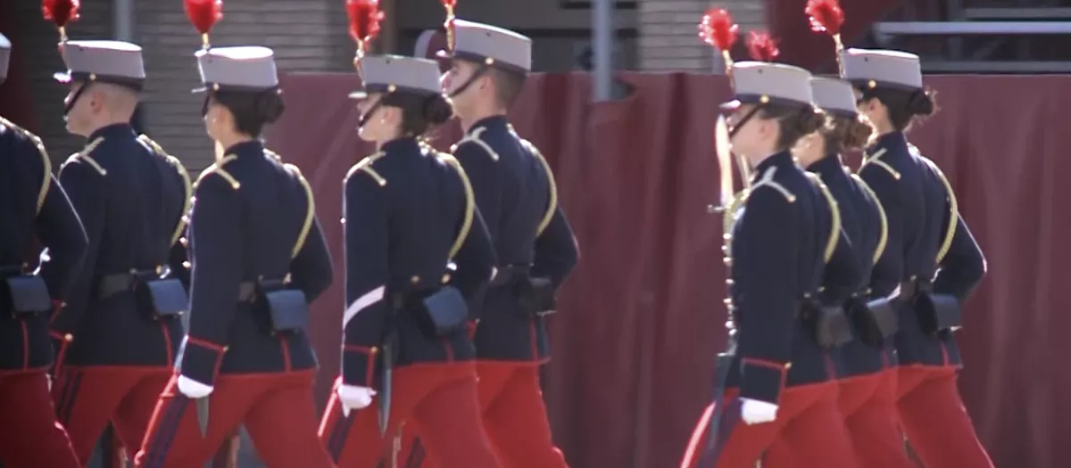 La Heredera de la Corona se encontraba en formación en el patio de armas con los restantes caballeros y damas cadetes de primer año. Todos ellos han lucido el uniforme de gala de cadete del Ejército de Tierra, formado por pantalón rojo, casaca azul y sombrero ros español con una pluma blanca.