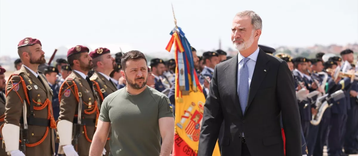 En su primer visita a España, Zelenski firmó con el jefe del Ejecutivo en el Palacio de Moncloa un acuerdo bilateral de seguridad y defensa que se extendió a ámbitos como la asistencia humanitaria, la reconstrucción del país y «la búsqueda de una paz justa y duradera basada en el derecho internacional». Asimismo, los Reyes de España organizaron un almuerzo de honor con el mandatario internacional en el Palacio Real.