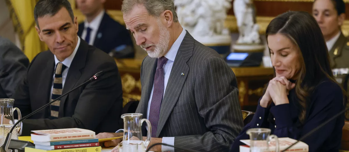 El Rey ha advertido este martes que «ninguna etapa de la historia ha estado exenta de trabas y dificultades para la cultura y esta, también tiene las suyas: baste ver una situación geopolítica que nos habla, con demasiada frecuencia, de conflictos, rivalidades, desconexión…». Don Felipe ha hecho estas afirmaciones en el brindis del almuerzo que ha ofrecido junto a la Reina en el Palacio de Aranjuez con motivo de la reunión del Patronato del Instituto Cervantes.