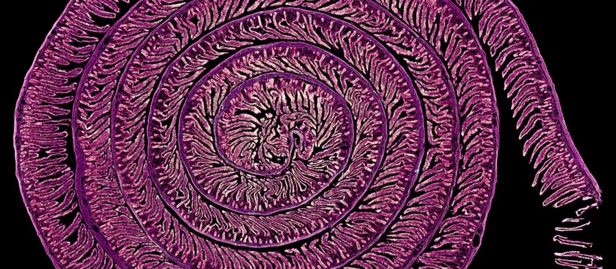 Una solución técnica para un órgano «difícil» de mirar por dentro. La imagen seleccionada corresponde a una micrografía obtenida a partir de un corte de pocas micras de grosor que abarca 8,5 centímetros de intestino de rata, captada con un objetivo 10x, en la que se distinguen vellosidades y criptas intestinales dispuestas en una voluta o espiral.
