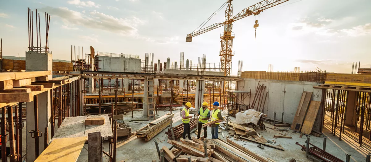 Construction industry concept - architects and engineers discussing work progress between concrete walls, scaffolds and cranes.