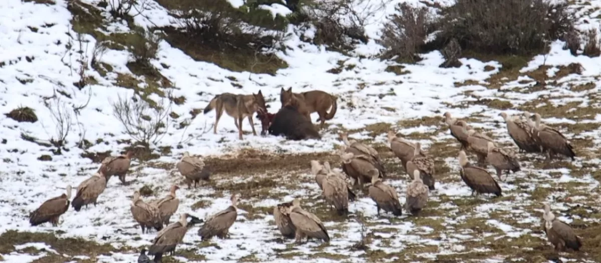 Lobos y buitres se disputan un jabalí muerto en León