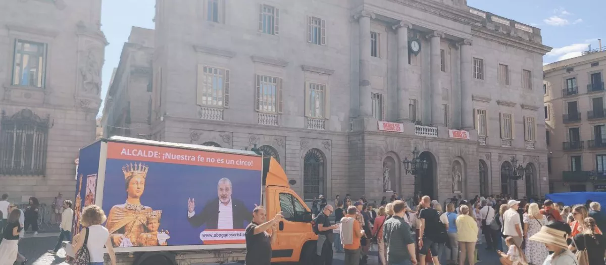 Agentes de la Guardia Urbana de Barcelona han detenido esta mañana un camión de la Fundación Española de Abogados Cristianos que recorría las calles de la ciudad como parte de una campaña contra el polémico cartel de las fiestas de la Mercè. Según la asociación, los agentes obligaron al conductor a retirar el vinilado publicitario y apagar las pantallas del vehículo, que mostraban imágenes de la Virgen de la Mercè con el lema «Nuestra fe no es un circo».